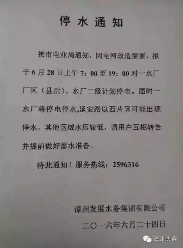 根據(jù)漳州市電業(yè)局通知,因電網(wǎng)改造需要,6月28日上午7:00至19:00,將對(duì)漳州一水廠廠區(qū)(縣后)、水廠二級(jí)計(jì)劃停電。屆時(shí),一水廠將停電停水,延安路以西片區(qū)可能出現(xiàn)停水,其他區(qū)域水壓較低,請(qǐng)用戶互相轉(zhuǎn)告并提前做好蓄水準(zhǔn)備。